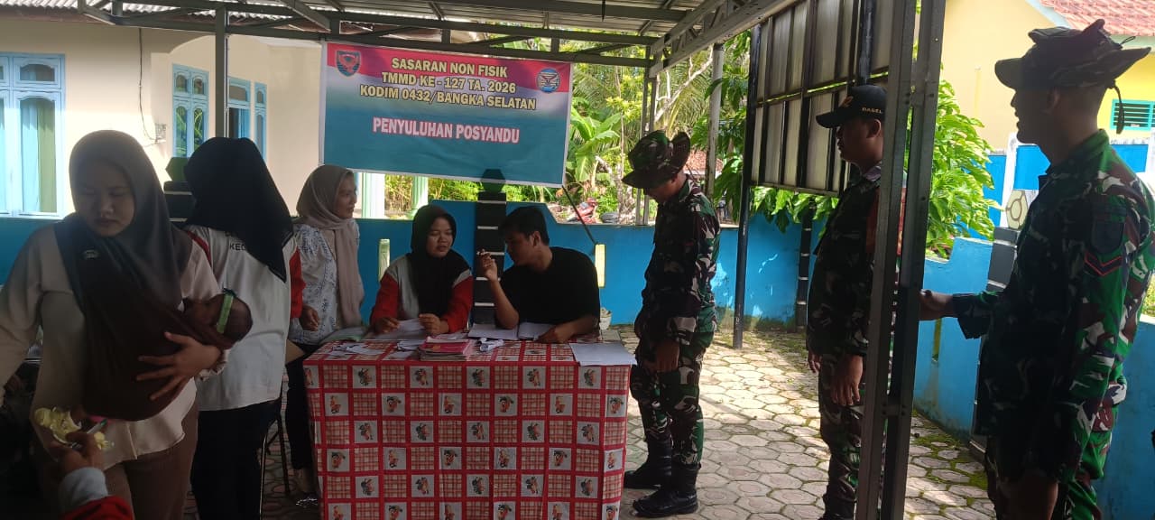 BASELPOS.CO, Toboali – Dalam rangka mendukung peningkatan derajat kesehatan masyarakat,TNI Manunggal Membangun Desa (TMMD) Ke-127 Tahun Anggaran 2026 Kodim 0432/Bangka Selatan melaksanakan kegiatan penyuluhan Posyandu di Halaman Kantor Desa Penutuk, Kecamatan Lepar, Kabupaten Bangka Selatan, Senin (11/8/2025).